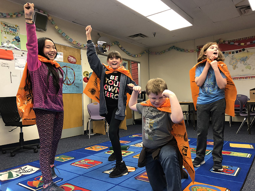 Young Global Citizens learn about the power of their part, whether it's learning that polyethylene film is the stretchy plastic that can be recycled or that most of the parts of batteries can be recycled. These recycling superheroes are powered up!
